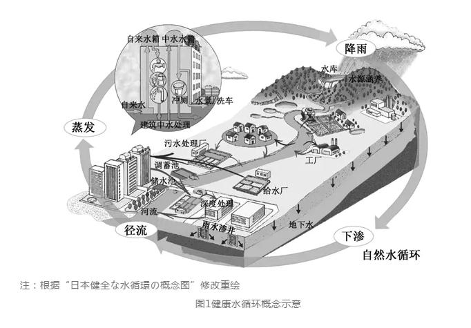 2014年至今,日本城市水系統(tǒng)進入了體系優(yōu)化階段,這一階段最顯著的特點是健康水循環(huán)理念得到前所未有的重視,城市水系統(tǒng)工作從要素治理向系統(tǒng)綜合整治轉(zhuǎn)變。事實上,日本很早就開始重視水循環(huán)的重要作用,2000年制定的《全國綜合水資源計劃》(又稱“21世紀(jì)水計劃”)就提出了構(gòu)筑可持續(xù)的用水體系,適應(yīng)循環(huán)型社會發(fā)展的要求,但由于種種原因,這一理念在涉水工作發(fā)展進程中并未被完全落實。隨著日本經(jīng)濟社會發(fā)展模式的轉(zhuǎn)變,人口老齡化和氣候變暖等多種因素的影響,加以城市水資源、水環(huán)境、水安全問題仍舊凸顯,日本的城市規(guī)劃建設(shè)者開始意識到城市水系統(tǒng)是城市復(fù)雜大系統(tǒng)的重要組成部分,涉及城市水資源開發(fā)利用、水環(huán)境治理保護、水安全保障提升等全要素全過程,局部的涉水工作難以解決整體問題,需要用系統(tǒng)的思維來認識和分析面臨的水問題,以城市為核心構(gòu)建健康水循環(huán)才能實現(xiàn)城市水系統(tǒng)對經(jīng)濟社會的永續(xù)支撐(見圖1)。