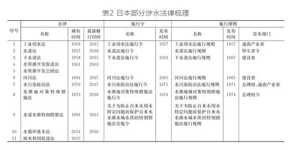 日本的法律體系可以分為憲法、法律、政令、省令和通達5個層次。通過國會頒布法律、內(nèi)閣頒布政令以及省頒布省令,對涉水工作進行全面的規(guī)定(見表2)。例如國會頒布《河川法》,內(nèi)閣負責(zé)發(fā)布《河川法施行令》,主管河道的國土交通省負責(zé)發(fā)布《河川法施行規(guī)則》。整個法律體系層次清晰、責(zé)任明確、詳略互補,全方位指導(dǎo)涉水工作的開展。日本城市水系統(tǒng)相關(guān)法律較為豐富,核心的涉水法律有《河川法》《水資源開發(fā)促進法》《水道法》《下水道法》《水污染防治法》等10余部,覆蓋了河流水系、水資源、供水、用水、排水、水環(huán)境和健康水循環(huán)理念等水系統(tǒng)多角度、全要素的內(nèi)容。日本涉水法律內(nèi)容詳盡,明確涉水工作的責(zé)任主體、職能分工、協(xié)調(diào)機制,部分法律還對技術(shù)標(biāo)準(zhǔn)進行詳細規(guī)定,例如《水道法》將水質(zhì)基準(zhǔn)的內(nèi)容納入法律框架體系,強化了標(biāo)準(zhǔn)執(zhí)行力度。日本涉水法律體系修訂更新周期短,如有必要最短1年時間即可開展法律修訂,例如《下水道法》在2005年、2011年和2015年分別針對城市內(nèi)澇、事權(quán)改革、雨水公共下水道建設(shè)問題開展修訂,極大的保障了法律的適應(yīng)性。