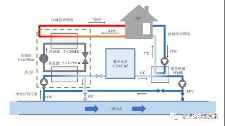 優勢:污水處理廠出水比原污水具有更高的潛熱值,通過水源熱泵系統提取熱能也相對容易,可避免熱交換器(熱泵)防污、防堵、防腐構造等問題。