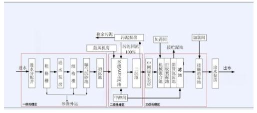 典型的污水廠處理工藝流程是上述方法的組合。以某一級(jí)a標(biāo)準(zhǔn)污水處理廠為例,從進(jìn)水到出水主要分三級(jí)處理區(qū),一級(jí)處理區(qū)主要應(yīng)用物理法(包括攔截、沉淀、除砂等)及一定的化學(xué)法(初沉池前絮凝);二級(jí)處理區(qū)是污水處理工藝核心,主要是以活性污泥為主的生化反應(yīng)(酶促反應(yīng));三級(jí)處理區(qū)主要應(yīng)用物理化學(xué)法,通過混凝、過濾、消毒等工藝手段對(duì)污水進(jìn)行深度處理。落實(shí)到具體處理工程中,各級(jí)各類技術(shù)需針對(duì)不同污染物和污染情況進(jìn)行應(yīng)用和改進(jìn)。