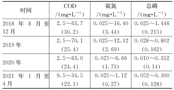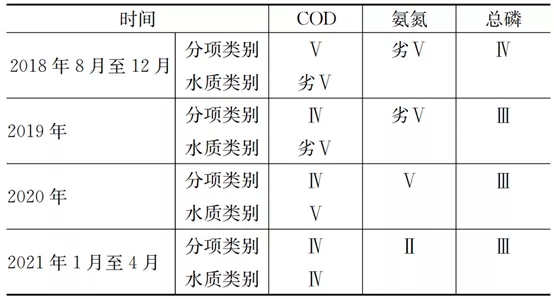 練江流域新一輪的整治工作重點中,加強污水處理產及配套管網的建設以擴大污水收集能力及處理能力,配合河道清理、清淤及垃圾處置,流域水質不斷改善。海門灣橋閘斷面2018年至2021年的水質監測數據見表1和表2。