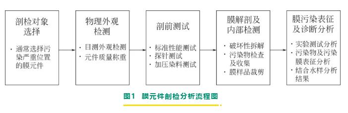 膜元件剖檢分析流程主要包括對(duì)膜元件的選擇、檢測(cè)和分析,具體是指剖檢對(duì)象選擇、物理外觀檢測(cè)、剖前測(cè)試、膜解剖及內(nèi)部檢測(cè)、膜污染表征及診斷分析五個(gè)步驟。圖1是膜剖檢分析流程圖。