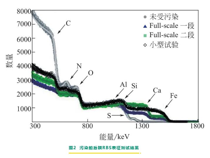 無機(jī)污染主要是由水中存在的無機(jī)鹽在膜表面逐漸累積,最終形成的無機(jī)垢所引起的。無機(jī)鹽結(jié)垢過程較復(fù)雜,常存在多種無機(jī)鹽的共沉淀和相互作用。sem、eds、xrd等結(jié)構(gòu)表征和膜表面滴酸測(cè)試是常用的無機(jī)污染診斷手段。ruiz-garcía等對(duì)用于苦咸水脫鹽運(yùn)行11年的反滲透膜元件進(jìn)行了剖檢分析,剖檢對(duì)象選擇的是四種不同位置的膜元件,分別包含一段和二段反滲透系統(tǒng)的首末支膜。其中一段的第一支膜可以直觀地看到有褐色沉積物,二段的最末支膜可以看到有粗糙的黃色垢,經(jīng)sem-eds表征及膜表面滴酸分析,得出膜污染物主要是含有碳酸鈣和硅鋁酸鹽的無機(jī)污染。xps是常用于表征膜表面元素組成和化學(xué)結(jié)構(gòu)的分析手段,但xps只能檢測(cè)膜皮層頂端,檢測(cè)深度一般只有7nm;rbs也可以用于分析膜表面元素組成和結(jié)構(gòu),且rbs檢測(cè)深度約2μm,比xps能檢測(cè)的深度更深,因此rbs還能用于檢測(cè)污染層的厚度。gorzalski等利用rbs研究膜表面污染物情況,對(duì)用于含硅地下水處理運(yùn)行2.5年的納濾膜元件進(jìn)行了剖檢分析,剖檢對(duì)象選擇的是一段和二段納濾系統(tǒng)的首末支膜元件。通過sem、xps、rbs等表征分析,得出膜污染物主要是含有fe、ca、si、al、s元素的無機(jī)污染,其中一段膜元件的si和al含量較高,二段膜元件的ca污染較重。表2和圖2是rbs對(duì)污染前后膜的表征結(jié)果對(duì)比,由rbs結(jié)果可得到xps無法獲得的信息,如不同工段的污染層厚度不同,并且rbs能探測(cè)整個(gè)污染層,與xps只能探測(cè)皮層所得到的si元素含量不同。