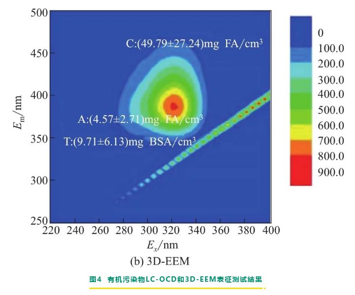 除了污染物和污染膜的表征外,水樣分析結(jié)果也可以對(duì)有機(jī)污染類型作出診斷。jeong等對(duì)用于海水淡化運(yùn)行8年的反滲透膜元件進(jìn)行了剖檢分析,剖檢對(duì)象選擇的是三種不同位置的膜元件,分別位于一級(jí)反滲透系統(tǒng)的前部、中部和后部。污染膜的表面可以看到有一層均勻的褐色沉積物,濃水側(cè)隔網(wǎng)和進(jìn)水側(cè)污染較重,產(chǎn)水側(cè)附近污染最輕。由lc-ocd和3d-eem表征的水樣測(cè)試結(jié)果(圖4)分析可得,膜的有機(jī)污染物主要是腐殖質(zhì)物質(zhì)和小分子中性物質(zhì)。tang等對(duì)用于城市污水回用處理運(yùn)行2個(gè)月的反滲透膜元件進(jìn)行了剖檢分析,該元件位于一段反滲透系統(tǒng),通過loi、ftir、doc、eem、樹脂分離等分析,得出膜污染物大部分是含不飽和碳或芳香環(huán)的微生物類和腐殖質(zhì)類有機(jī)污染。許家晟等對(duì)用于自來水廠出水深度處理的碟管式納濾膜進(jìn)行了膜污染分析,從膜表面可明顯看到一層較滑膩的黃色污泥層,并伴有黑色顆粒物質(zhì),且底部出水端膜片污染更嚴(yán)重。通過sem-eds分析得出,膜污染物以有機(jī)污染為主,經(jīng)ftir和3d-eem進(jìn)一步分析得出,膜表面的有機(jī)污染成分主要是類富里酸物質(zhì)、類腐殖酸物質(zhì)及一些微生物代謝產(chǎn)物,并存在一定程度的生物污染。