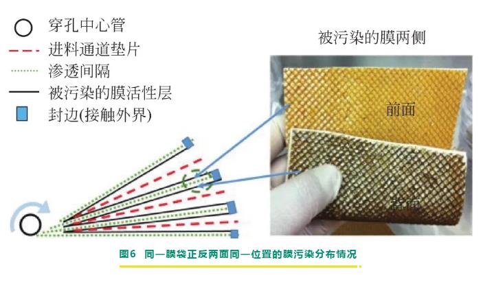膜解剖是對(duì)膜元件進(jìn)行破壞性拆解后,對(duì)膜元件進(jìn)行相關(guān)內(nèi)部檢測(cè)。內(nèi)部檢測(cè)主要包括膜袋、膜卷原水進(jìn)口端、濃水出口端、濃淡水隔網(wǎng)、膜片表面污染物的檢查。一方面可通過膜袋最外側(cè)膜片的折痕判斷產(chǎn)水背壓現(xiàn)象,另一方面通過詳細(xì)記錄的污染物顏色、性狀和氣味對(duì)膜污染情況進(jìn)行初判,并對(duì)膜樣品和污染物分別進(jìn)行裁剪和收集,以作后續(xù)分析。